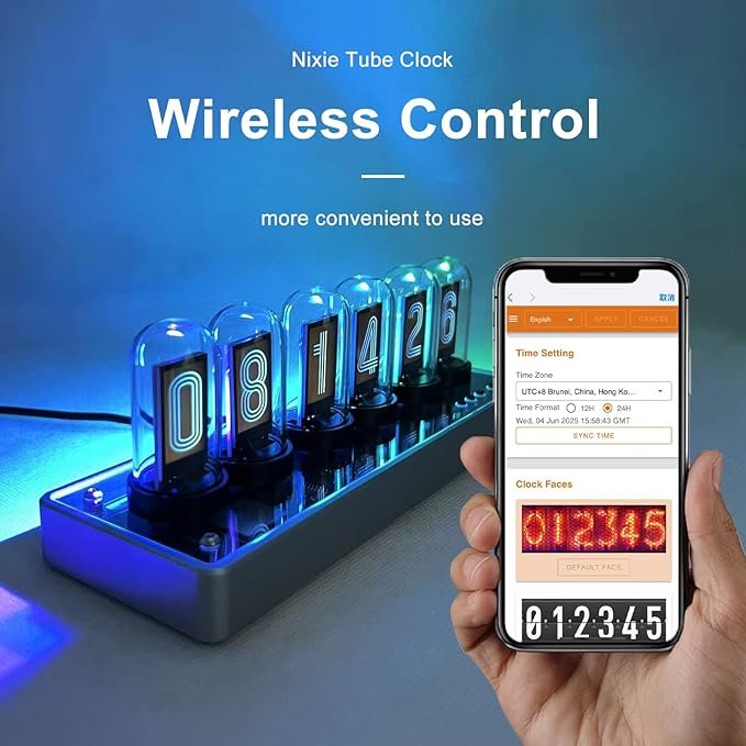 A retro-inspired digital clock with customizable glow tubes, WiFi control, and multiple time zone settings.