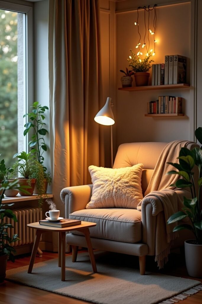 Think cozy lighting, clean spaces, and calming scents. Many people are creating “calm corners” small areas dedicated to relaxation.